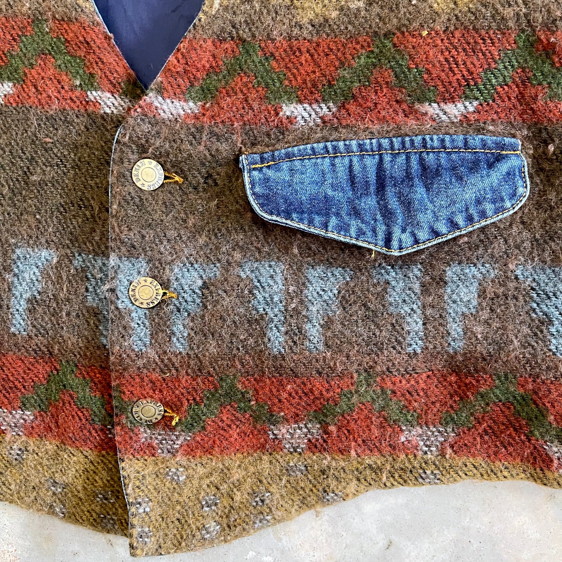 90s denim and aztec print wool panel vest. Made in Taiwan R.O.C.