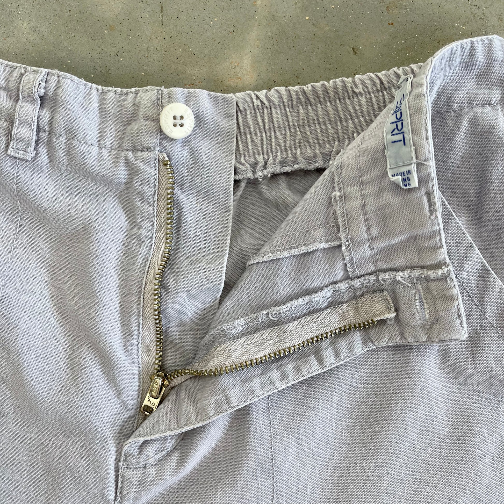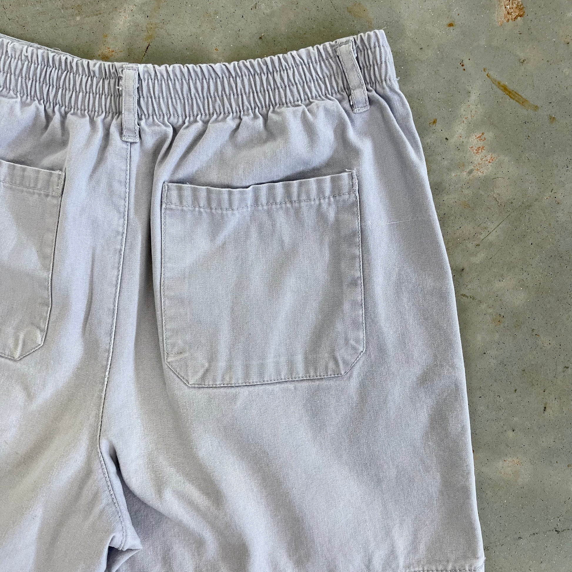 Light grey with a slight purple under tone. Talon brand zipper. Elastic waistband.