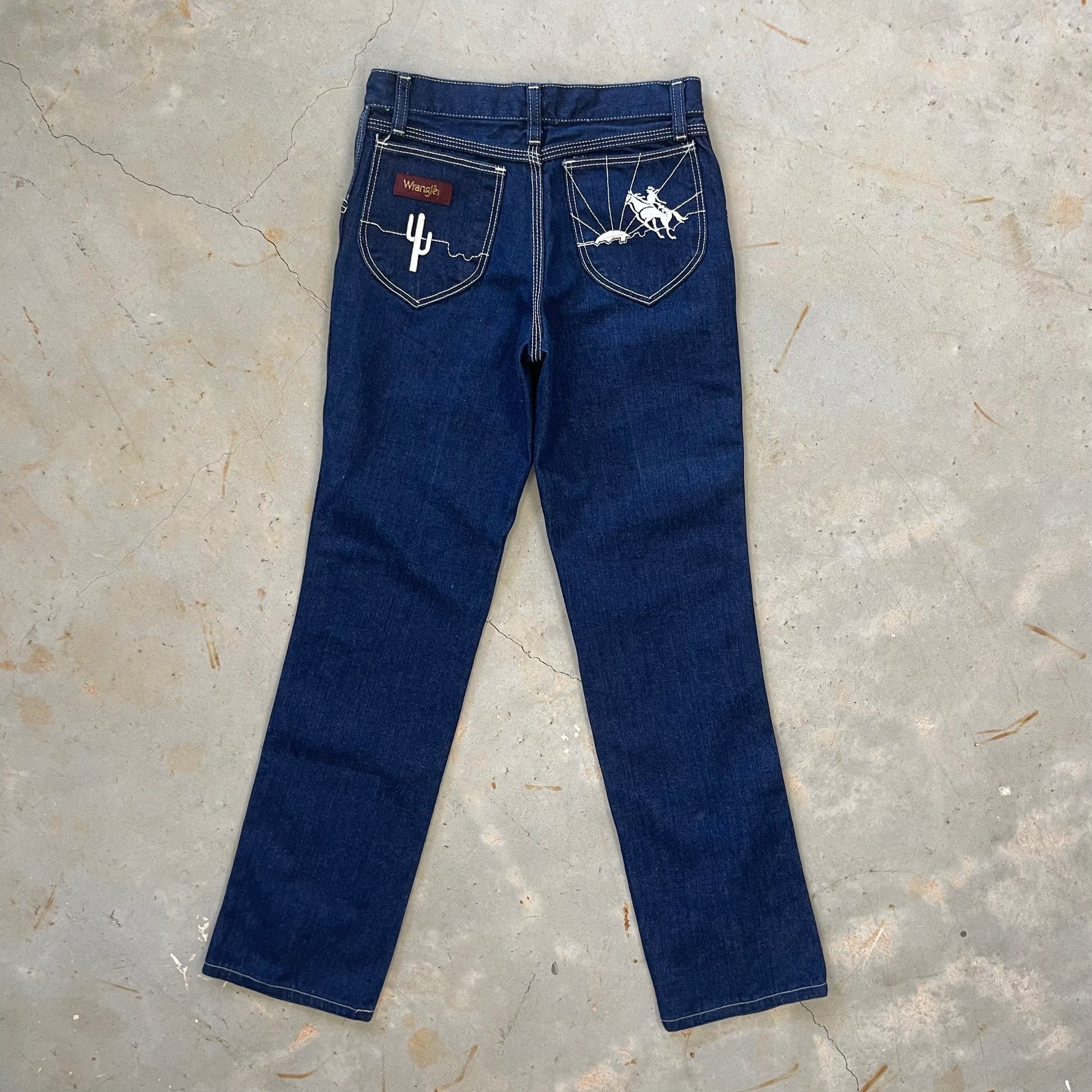 Student cut. Mid-rise. Extra soft cotton denim. Heavy white stitching detail.