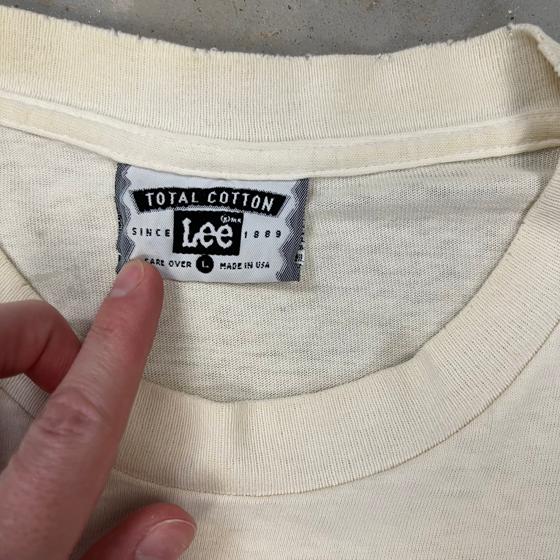Lee brand tag. Thin, soft 100% Cotton. Made in USA.