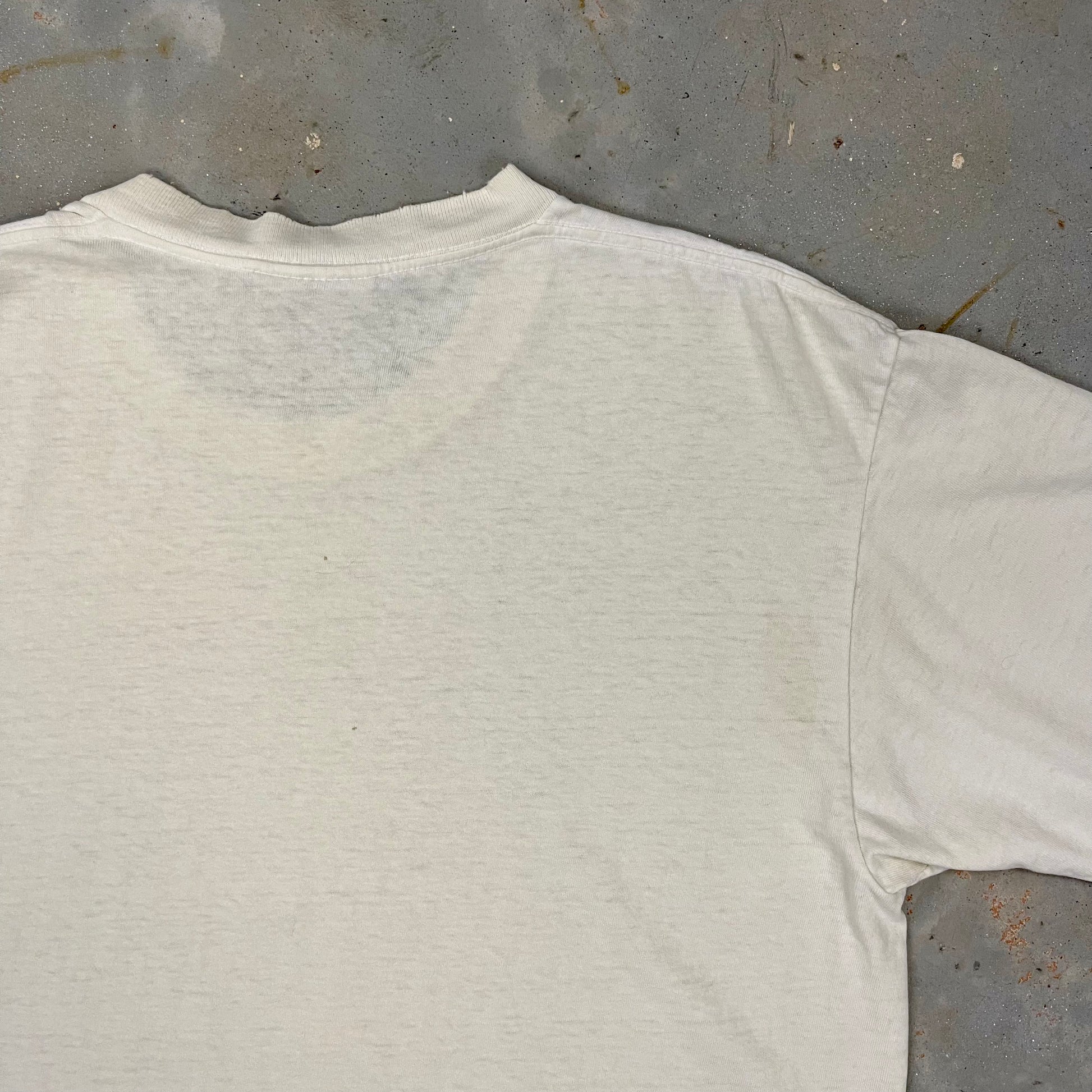 Yellowing and some holes throughout. Cracking/peeling on graphic. Perfectly beat up.