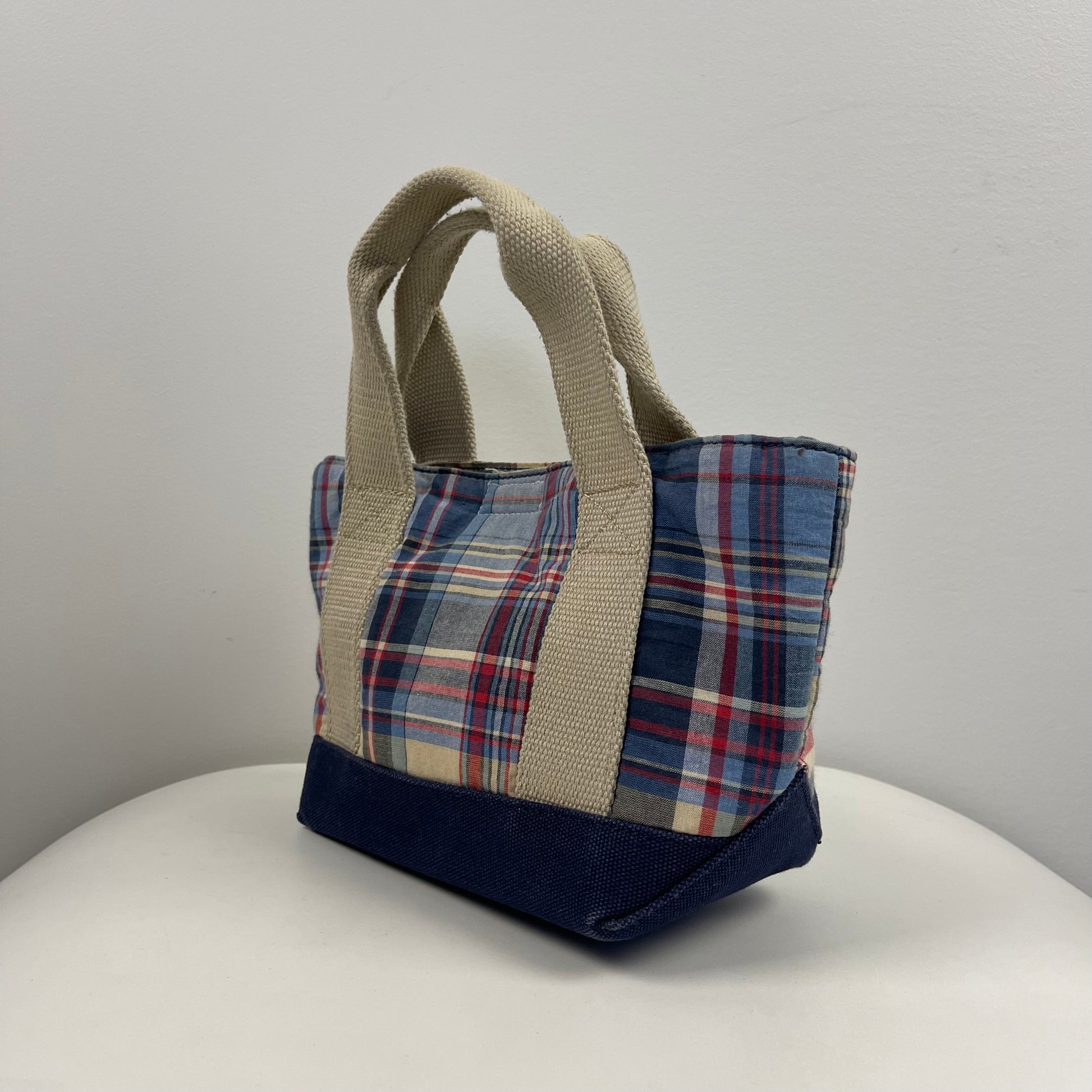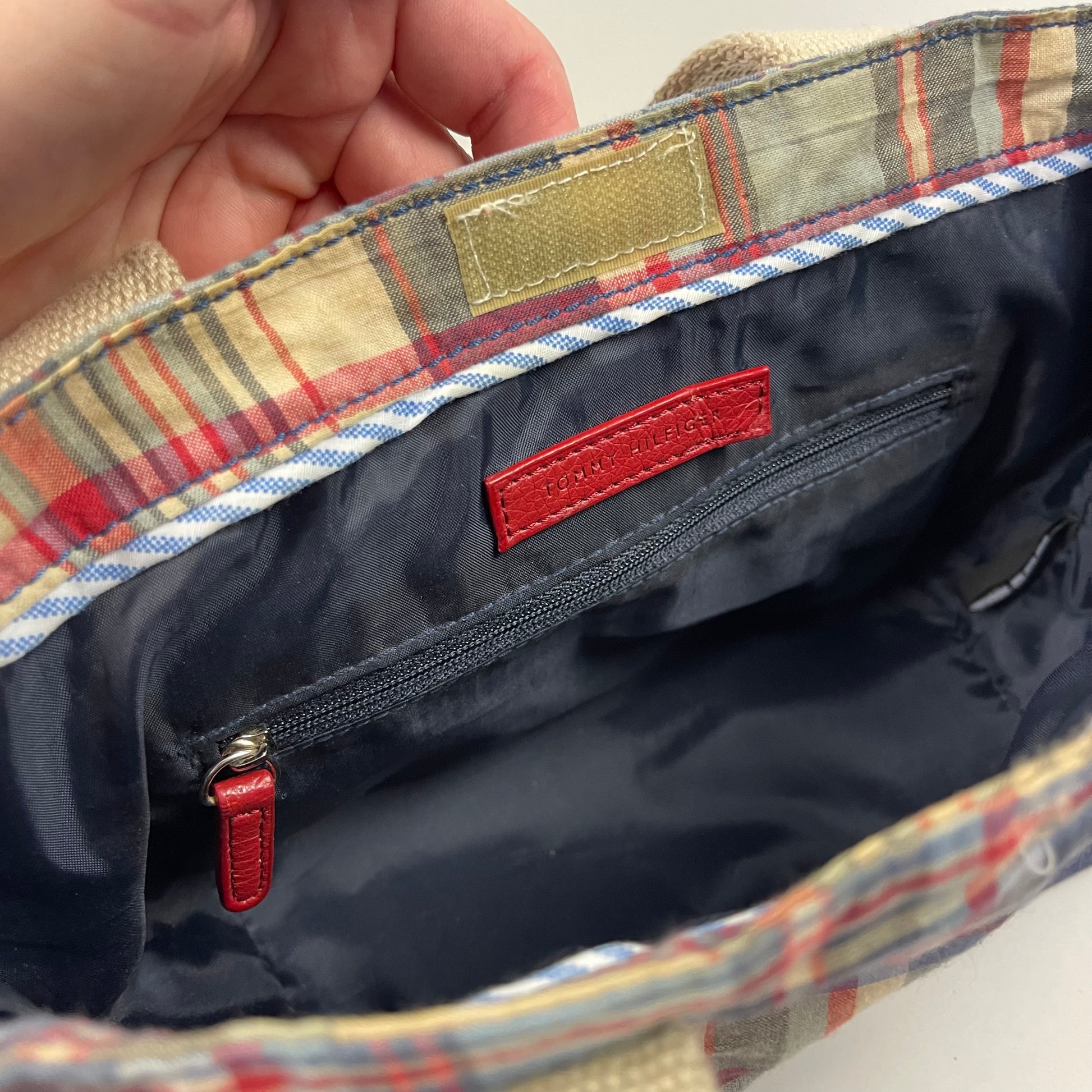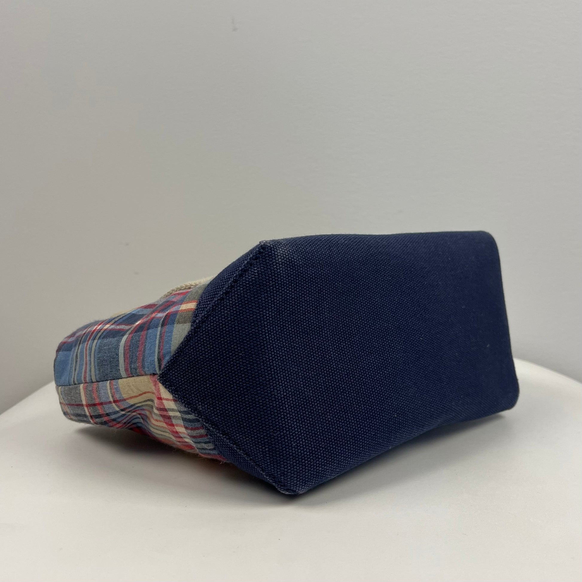 Plaid print cotton with canvas base and thick straps. Nylon lining. Velcro closure. One inside zip up pocket.