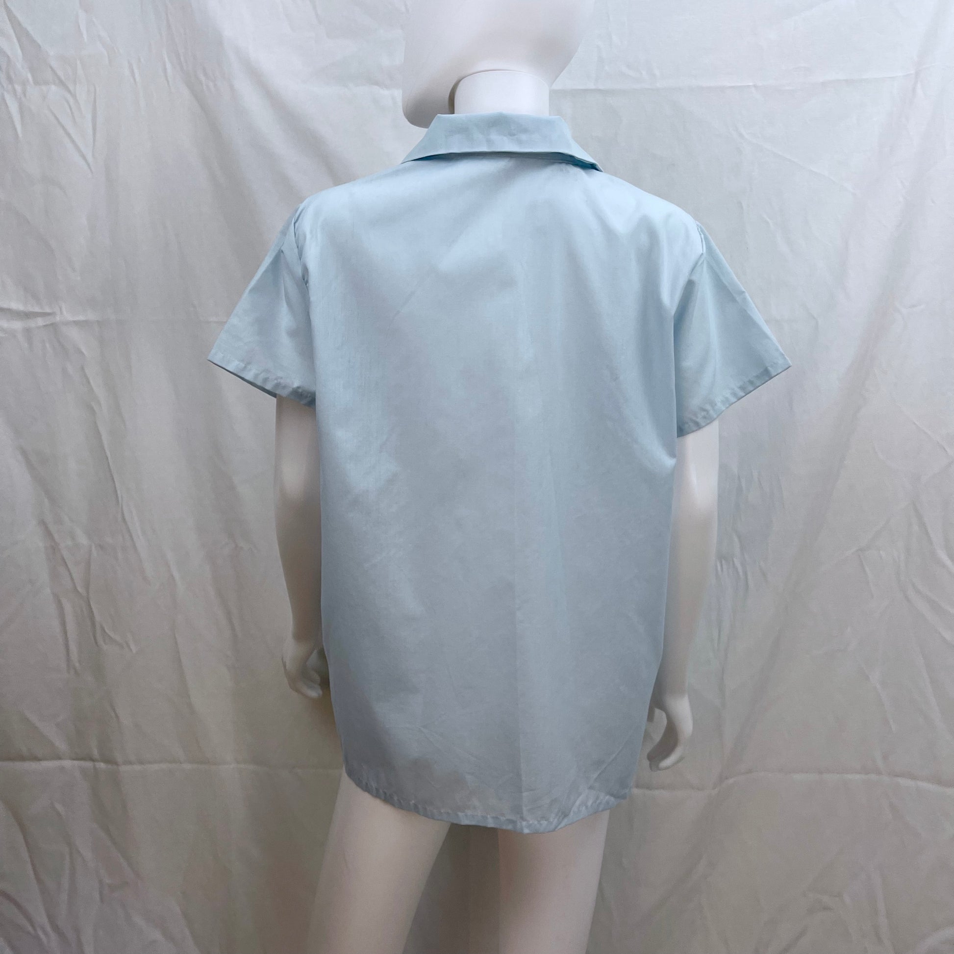 Light blue. Soft, lightweight Cotton/polyester blend.