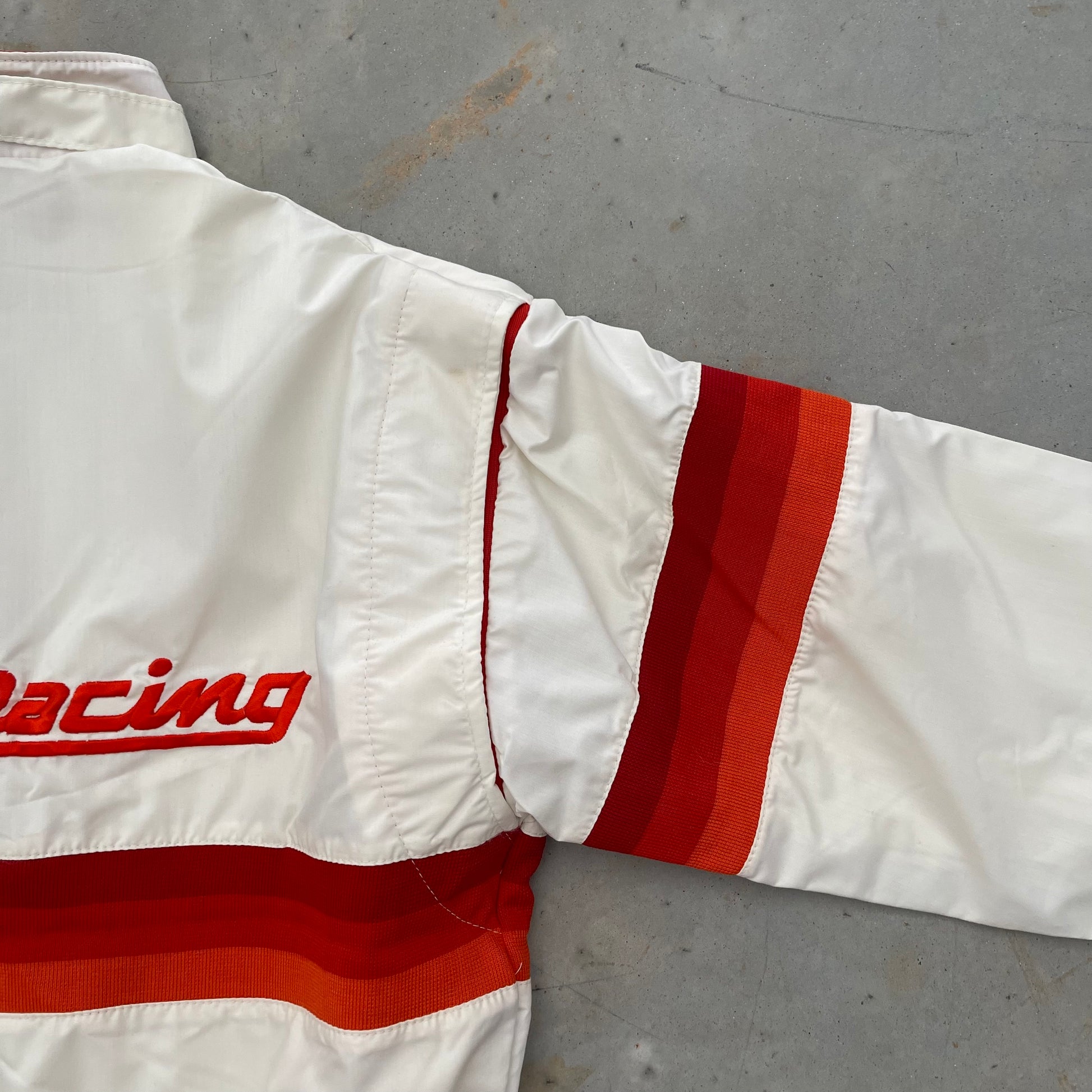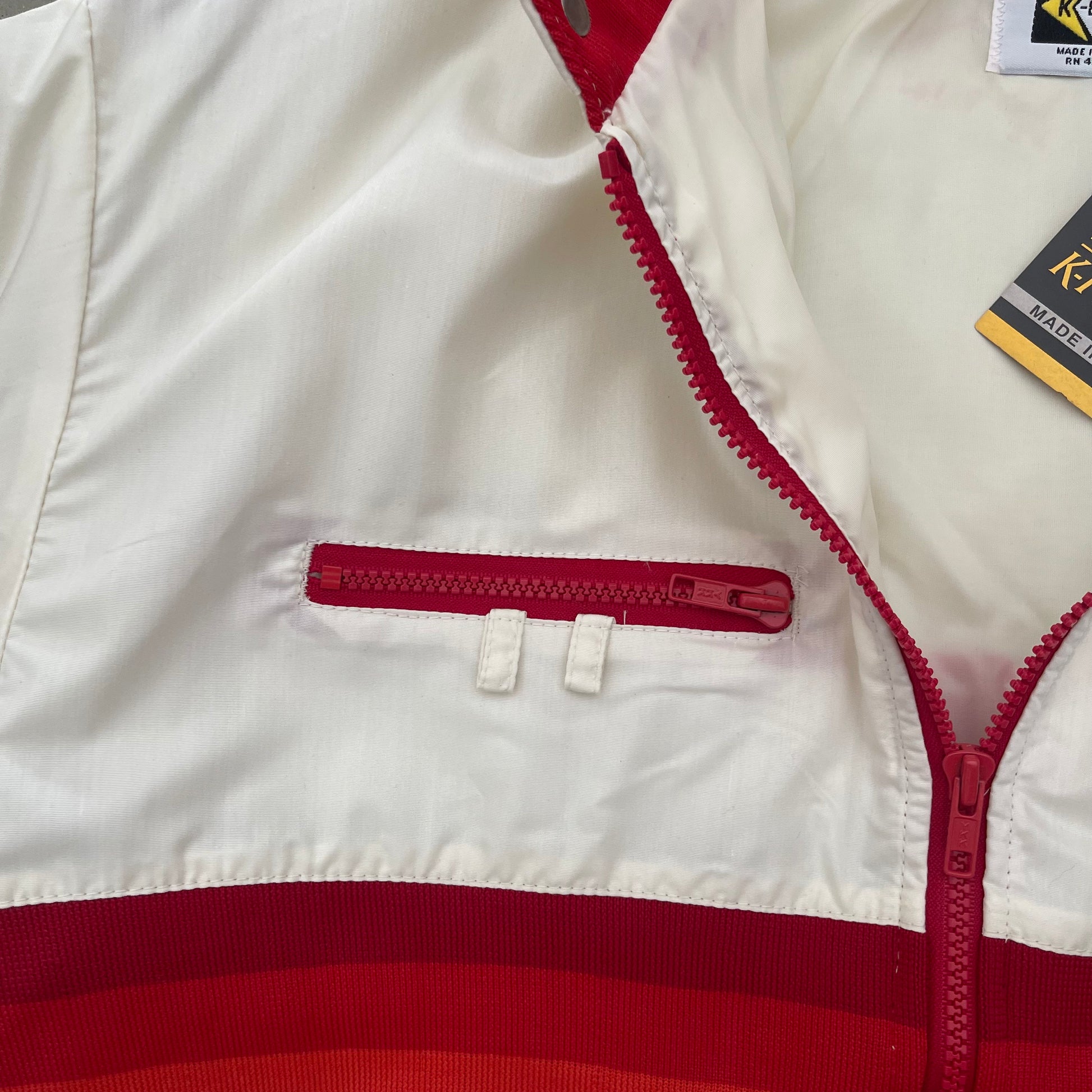 Red and orange elastic stripe detail. Zip up pockets. Snap button collar.