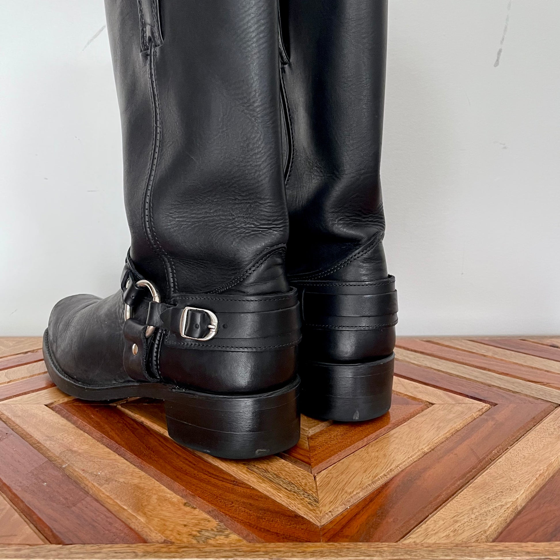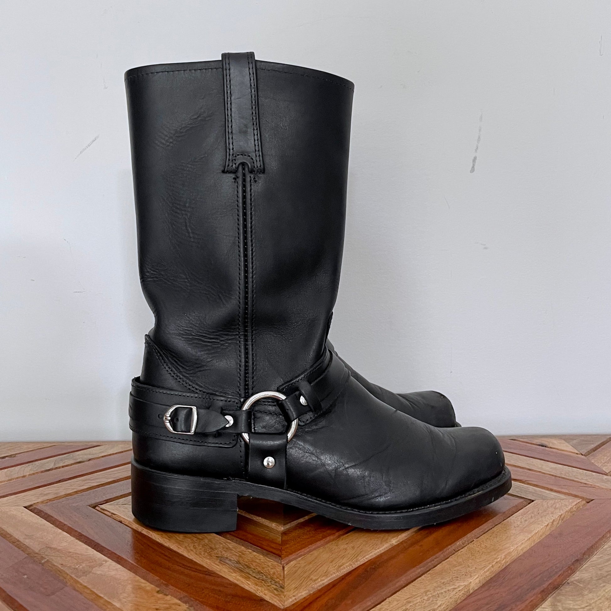 Classic square toe harness biker style boots.