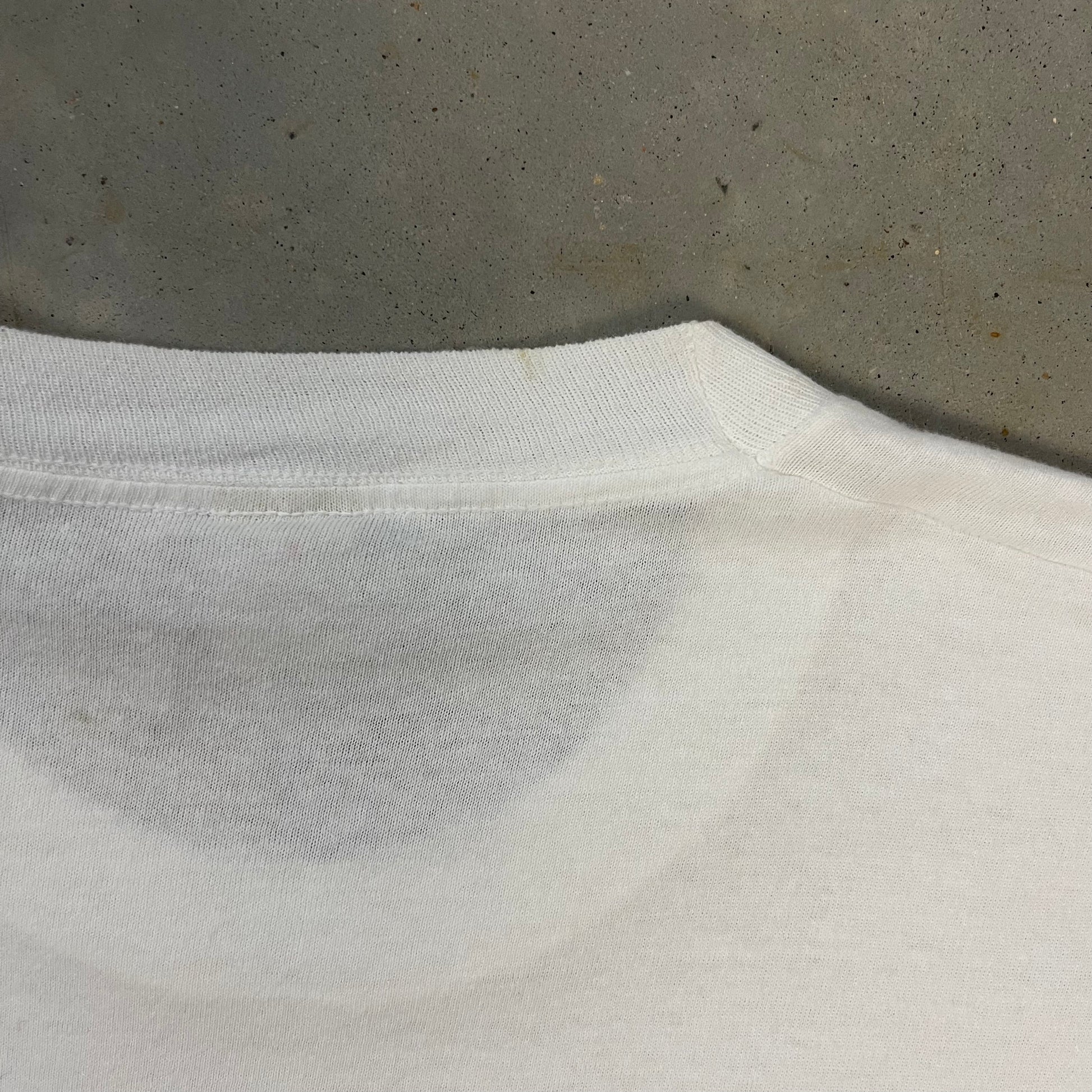 Single stitch all around. Thin cotton. Tag worn/faded.