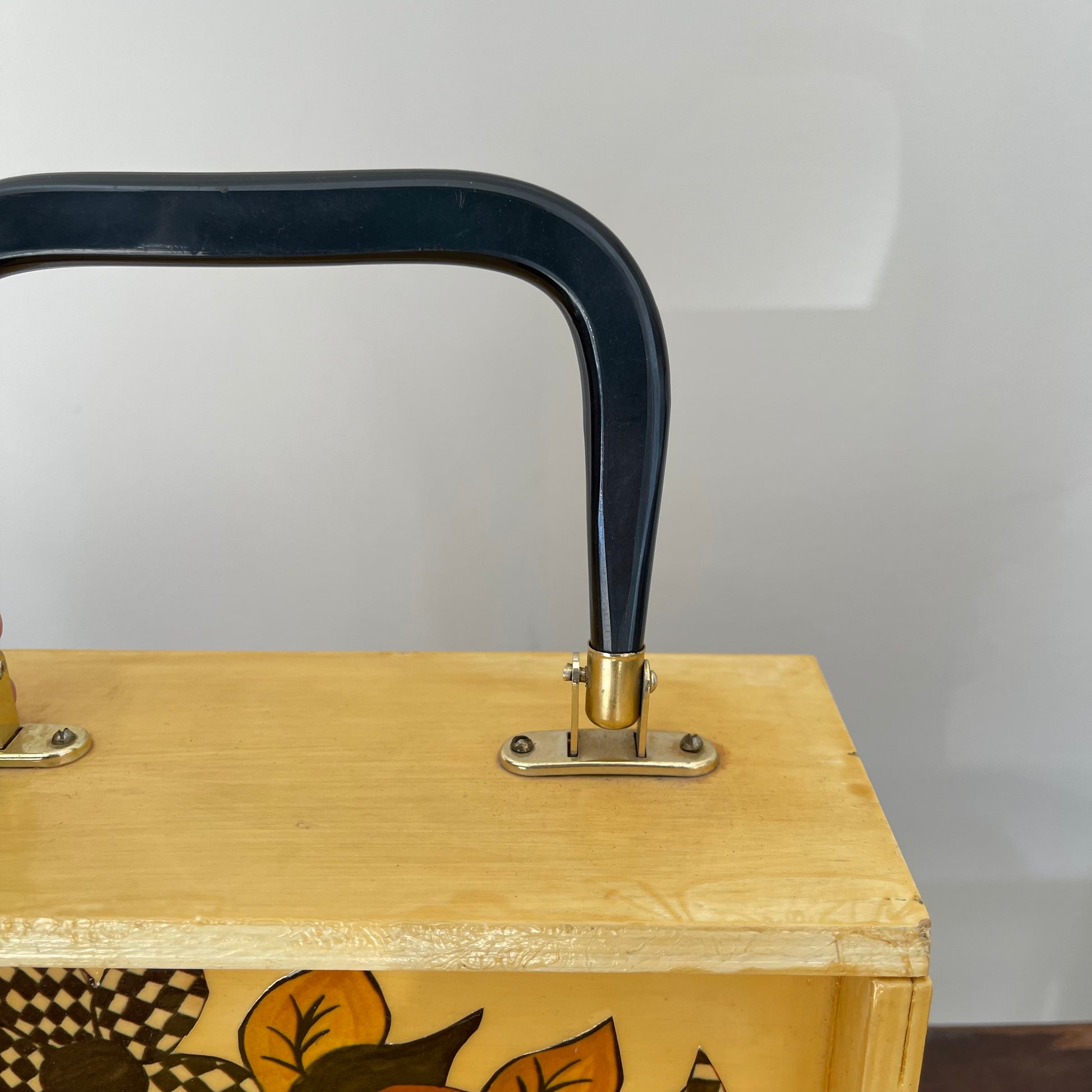 Hand-painted and sealed. Interchangeable front covers. Metal latch side closure. Fabric lining. Plastic top handle.